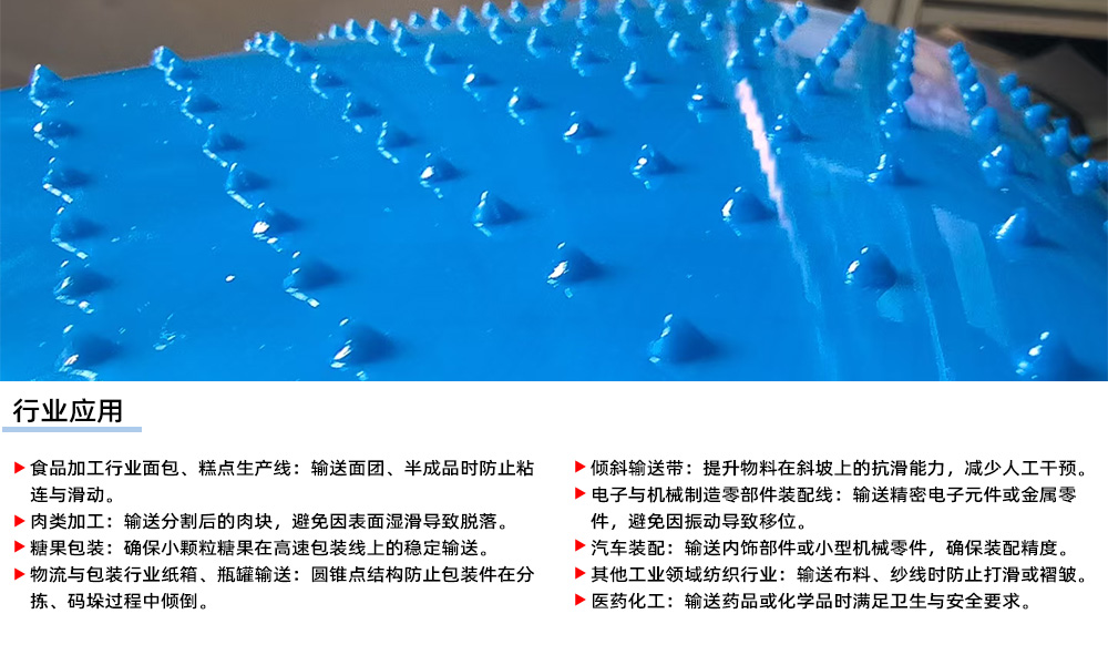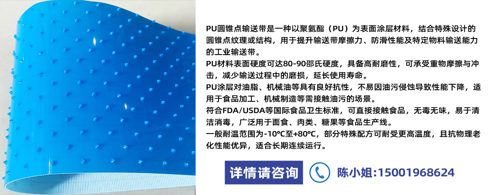 您現(xiàn)在的位置:產(chǎn)品展示>PU圓錐點(diǎn)輸送帶(肉類、水產(chǎn)、面包食品輸送)